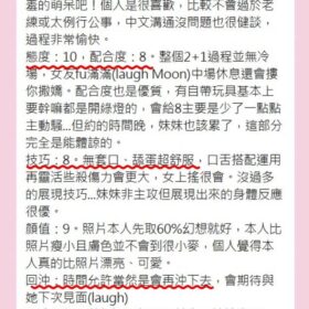 奶砲,按摩,共浴,LG(舌吻)依氣氛衛生而定,可親嘴,無套吹,品鮑,奶推,屁推,絲襪(自備免付),玩具(按摩棒),玩具(跳蛋),情趣用品(客自備),無套做,無套內射,後門,快餐,2S,NS