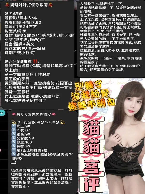 奶砲,毒龍,按摩,69,共浴,LG(舌吻)依氣氛衛生而定,可親嘴,無套吹,口爆,品鮑,舔蛋,奶推,屁推,顏射,浴中蕭,變裝(自備免付),絲襪(自備免付),玩具(按摩棒),玩具(跳蛋),情趣用品(客自備),無套做,無套內射,快餐,2S