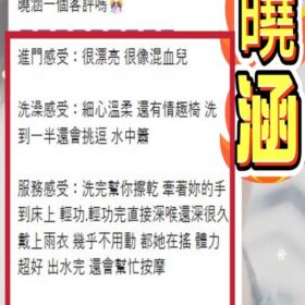 2S+500(60分)、口爆+500、口爆吞精+1000、顏射+500、後門+1000、情趣用品自慰秀+500(客自備)