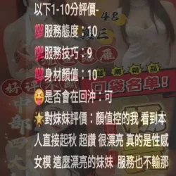 按摩,69,共浴,可親嘴,無套吹,口爆,品鮑,舔蛋,顏射,變裝(自備免付),絲襪(自備免付),玩具(按摩棒),玩具(跳蛋),情趣用品(客自備),自慰秀,攝影,快餐,2S