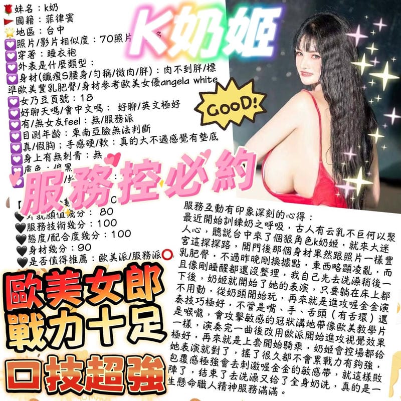 奶砲,裸舌毒龍,按摩,69,共浴,殘廢澡,LG(舌吻)依氣氛衛生而定,可親嘴,無套吹,口爆,足交,品鮑,舔蛋,奶推,屁推,顏射,浴中蕭,深喉嚨,變裝(自備免付),絲襪(自備免付),英文溝通,快餐,2S,射後清槍