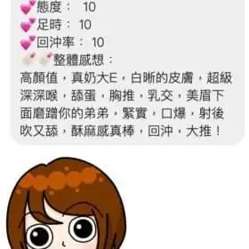 奶砲,毒龍,按摩,69,殘廢澡,LG(舌吻)依氣氛衛生而定,可親嘴,無套吹,口爆,吞精,足交,品鮑,舔蛋,冰火,自慰秀,中文溝通,快餐,2S