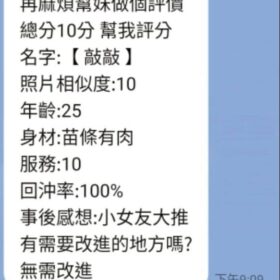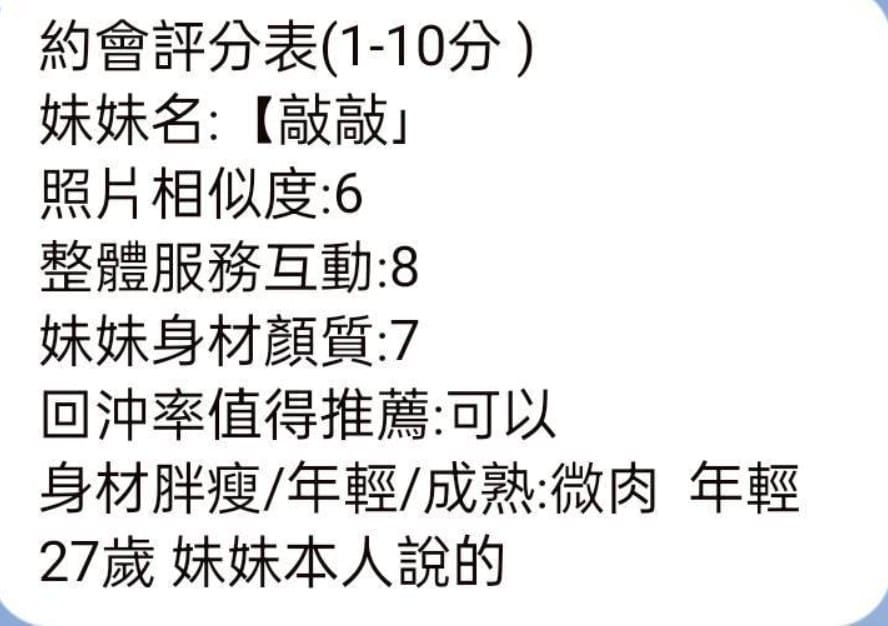2S+500(60分)、口爆+500、顏射+500、自慰秀+500、無套內射+1000、攝影+1000(不拍臉)、絲襪+100、0.01套+100