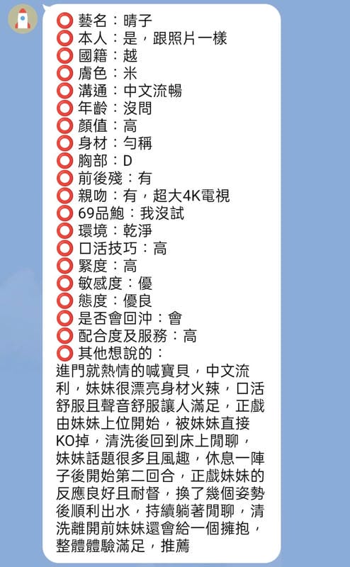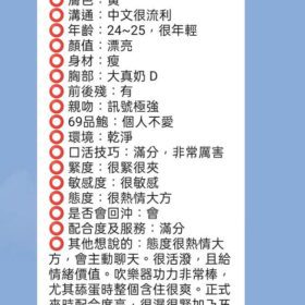 毒龍,按摩,69,LG(舌吻)依氣氛衛生而定,可親嘴,無套吹,口爆,品鮑,舔蛋,變裝(自備免付),絲襪,中文溝通,快餐,2S,包夜