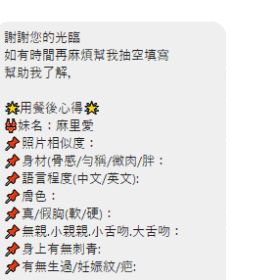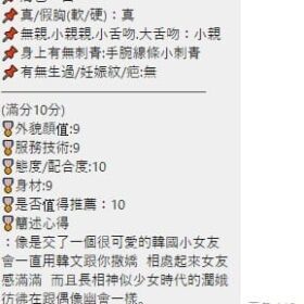 奶砲,69,殘廢澡,可親嘴,無套吹,足交,品鮑,奶推,屁推,浴中蕭,變裝(自備免付),絲襪(自備免付),無套做,無套內射,快餐,2S
