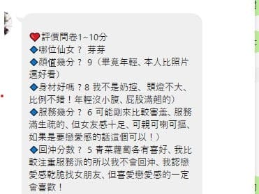 奶砲,毒龍,按摩,69,LG(舌吻)依氣氛衛生而定,可親嘴,無套吹,口爆,品鮑,舔蛋,顏射,水床浴,絲襪(自備免付),玩具(按摩棒),玩具(跳蛋),情趣用品(客自備),自慰秀,白人,英文溝通,快餐,2S,包夜