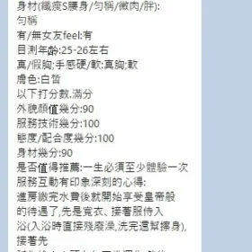 2S+500、口爆+500、吞精+500、顏射+500、自慰秀+500、絲襪+100、絲襪套裝+200、0.01套+100、後門+1000、攝影+1000(不露臉)