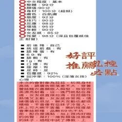 奶砲,按摩,69,共浴,LG(舌吻)依氣氛衛生而定,可親嘴,口爆,品鮑,奶推,屁推,顏射,浴中蕭,絲襪,絲襪(自備免付),玩具(按摩棒),玩具(跳蛋),情趣用品(客自備),無套內射,自慰秀,攝影,英文溝通,快餐,2S