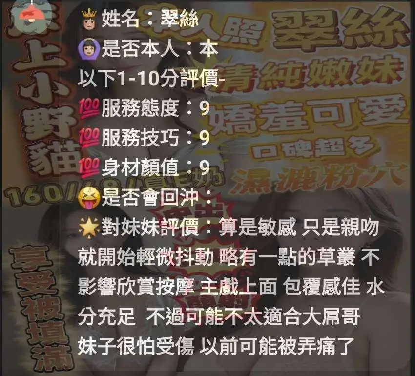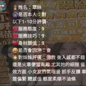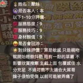 奶砲,按摩,69,共浴,殘廢澡,泰國浴,LG(舌吻)依氣氛衛生而定,可親嘴,無套吹,口爆,品鮑,舔蛋,奶推,屁推,顏射,絲襪(自備免付),玩具(按摩棒),玩具(跳蛋),情趣用品(客自備),無套做,無套內射,快餐,2S,NS