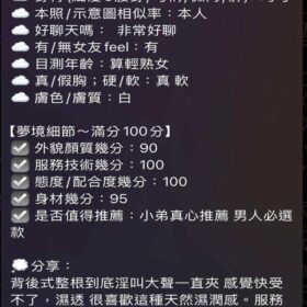 2S+500(60分)、無套外射+1000、後門+1000、口爆+500、吞精+500、顏射+500、情趣用品+500(客自備)、絲襪+100、0.01套+100