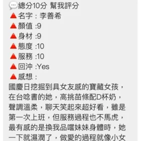 奶砲,按摩,69,共浴,LG(舌吻)依氣氛衛生而定,可親嘴,無套吹,足交,品鮑,舔蛋,過水,漫遊,奶推,屁推,冰火,顏射,深喉嚨,絲襪(自備免付),玩具(按摩棒),玩具(跳蛋),情趣用品(客自備),自慰秀,快餐,2S
