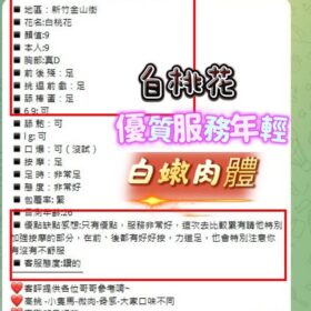 按摩,69,共浴,LG(舌吻)依氣氛衛生而定,可親嘴,無套吹,口爆,吞精,奶推,屁推,變裝(自備免付),絲襪(自備免付),無套做,無套內射,英文溝通,快餐,2S