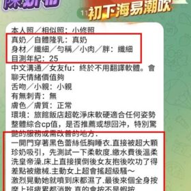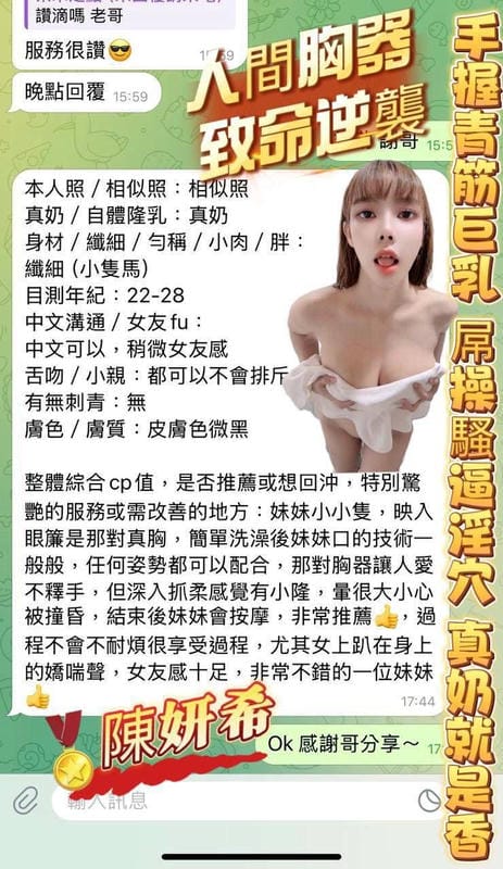 奶砲,毒龍,69,殘廢澡,LG(舌吻)依氣氛衛生而定,可親嘴,無套吹,口爆,舔蛋,漫遊,奶推,冰火,深喉嚨,艷舞秀,絲襪(自備免付),自慰秀,中文溝通,快餐,2S,NS,包夜