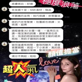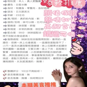 奶砲,按摩,69,共浴,泡泡浴,LG(舌吻)依氣氛衛生而定,可親嘴,無套吹,足交,品鮑,舔蛋,輕功,水床浴,浴中蕭,深喉嚨,變裝(自備免付),絲襪(自備免付),玩具(按摩棒),玩具(跳蛋),情趣用品(客自備),無套做,無套內射,自慰秀,攝影,2S,NS,包夜