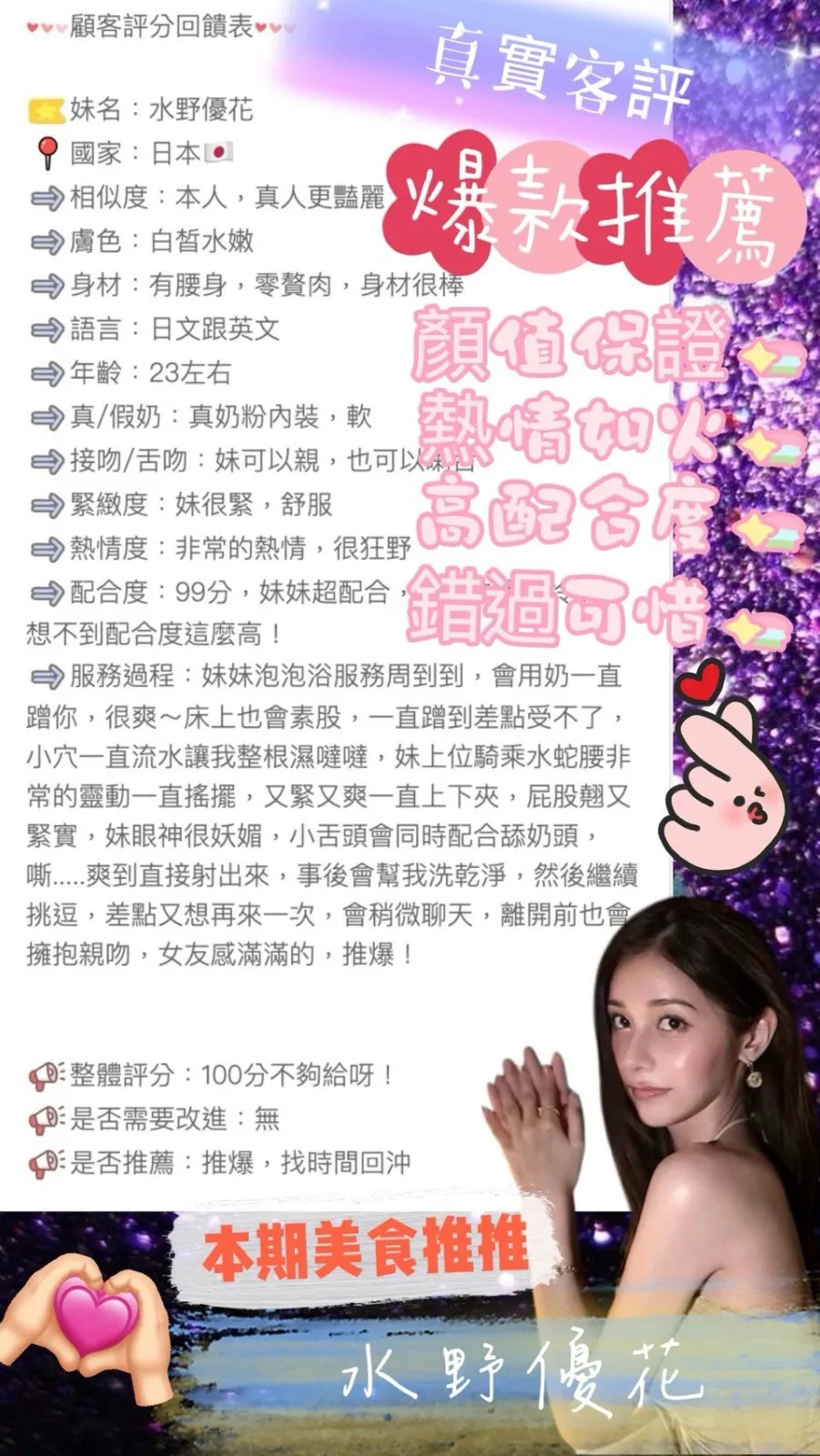 奶砲,按摩,69,共浴,泡泡浴,LG(舌吻)依氣氛衛生而定,可親嘴,無套吹,足交,品鮑,舔蛋,輕功,水床浴,浴中蕭,深喉嚨,變裝(自備免付),絲襪(自備免付),玩具(按摩棒),玩具(跳蛋),情趣用品(客自備),無套做,無套內射,自慰秀,攝影,NS,包夜