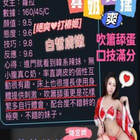 奶砲,毒龍,按摩,69,共浴,LG(舌吻)依氣氛衛生而定,可親嘴,無套吹,口爆,品鮑,舔蛋,奶推,屁推,顏射,浴中蕭,絲襪,玩具(按摩棒),玩具(跳蛋),情趣用品(客自備),無套做,無套內射,自慰秀,攝影,快餐,2S,NS,包夜