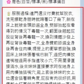 奶砲,毒龍,按摩,69,陪洗,共浴,LG(舌吻)依氣氛衛生而定,可親嘴,無套吹,口爆,足交,品鮑,舔蛋,冰火,深喉嚨,艷舞秀,自慰秀,快餐,2S,射後清槍