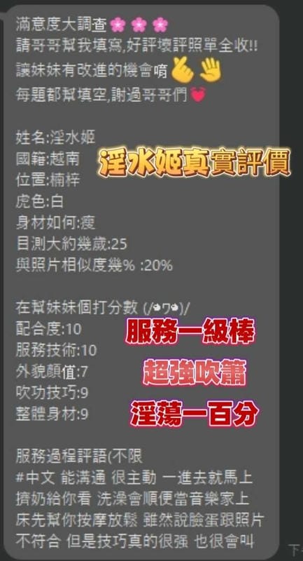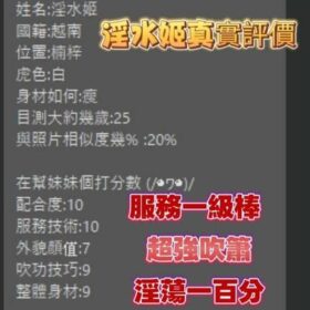 2S+500、口爆+500、吞精+500、顏射+500、自慰秀+500、攝影+1000(不拍臉)、0.01套+100、絲襪+100、絲襪套裝+200