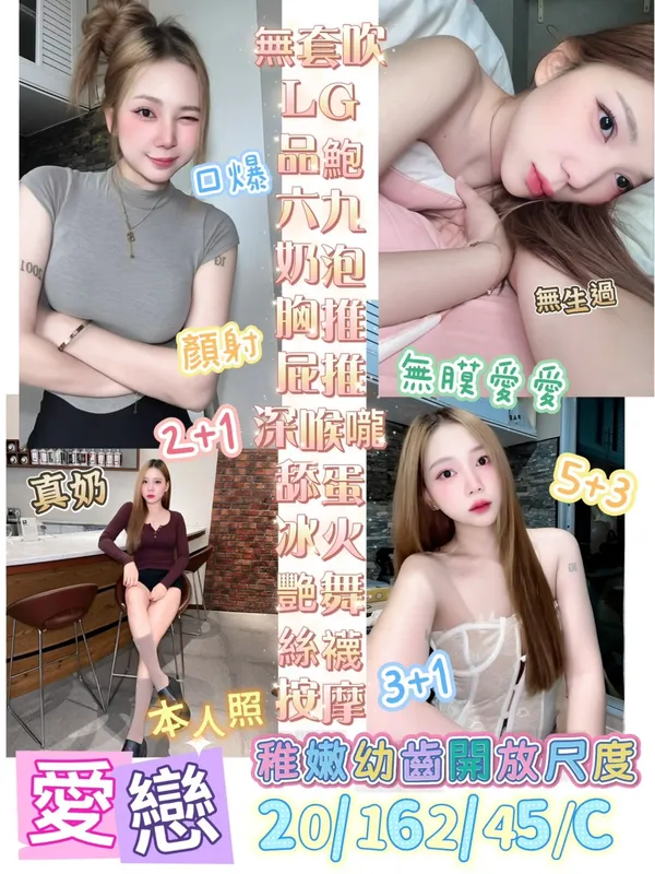 奶砲,按摩,69,陪洗,LG(舌吻)依氣氛衛生而定,可親嘴,無套吹,口爆,品鮑,舔蛋,奶推,屁推,冰火,顏射,深喉嚨,艷舞秀,絲襪,無套做,英文溝通,快餐,2S
