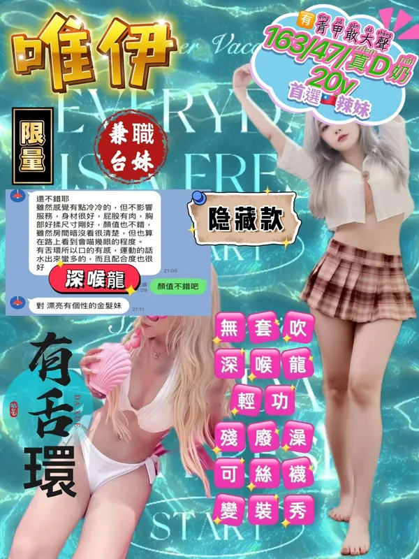 按摩,陪洗,共浴,殘廢澡,帝王浴,LG(舌吻)依氣氛衛生而定,可親嘴,無套吹,足交,輕功,漫遊,屁推,深喉嚨,變裝(自備免付),絲襪(自備免付)